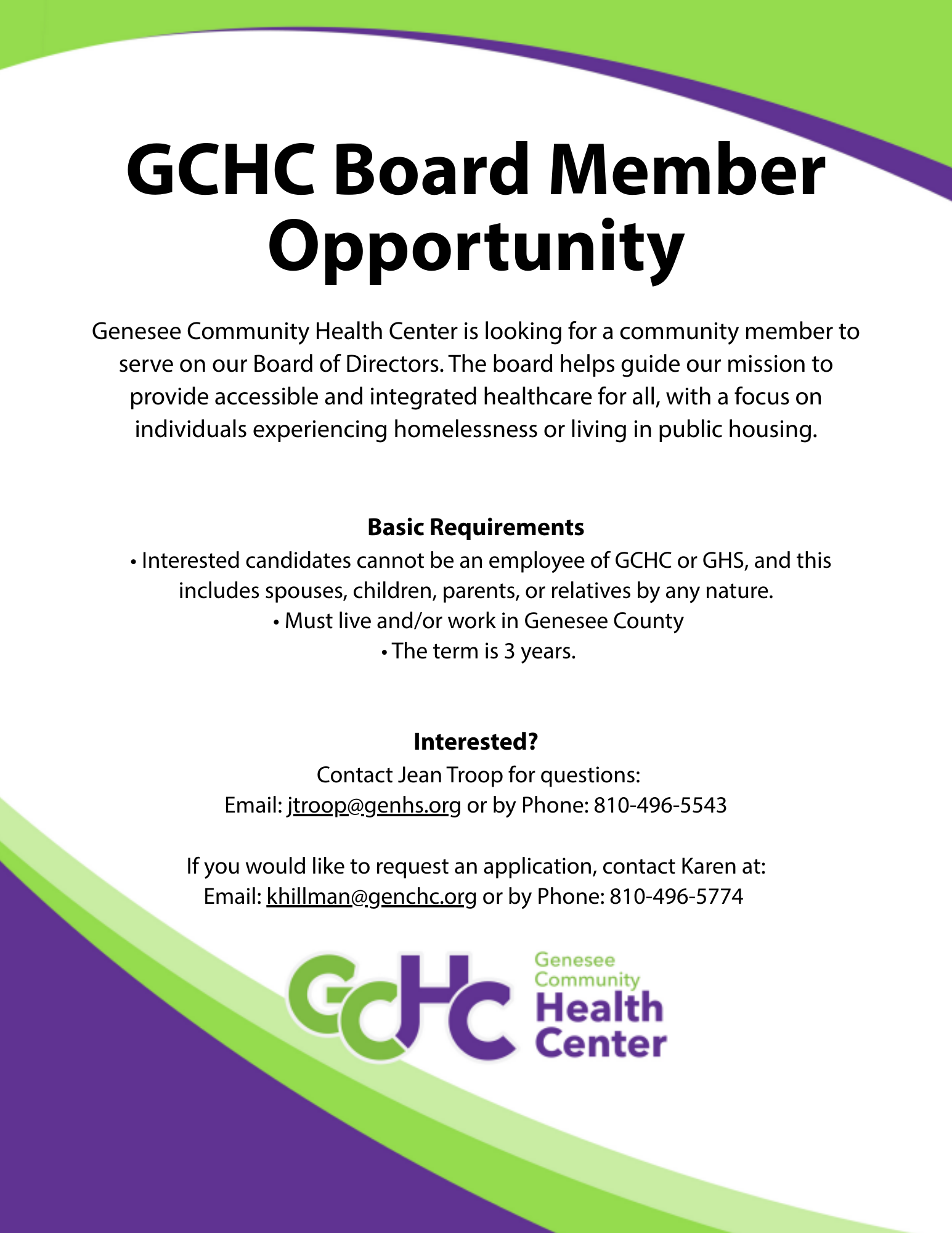 Genesee Community Health Center is seeking a committed community member to join its Board of Directors and help guide the organization’s mission of providing accessible, integrated health care for all residents of Genesee County. Individuals who meet the eligibility requirements are encouraged to apply and support the continued growth and impact of GCHC.