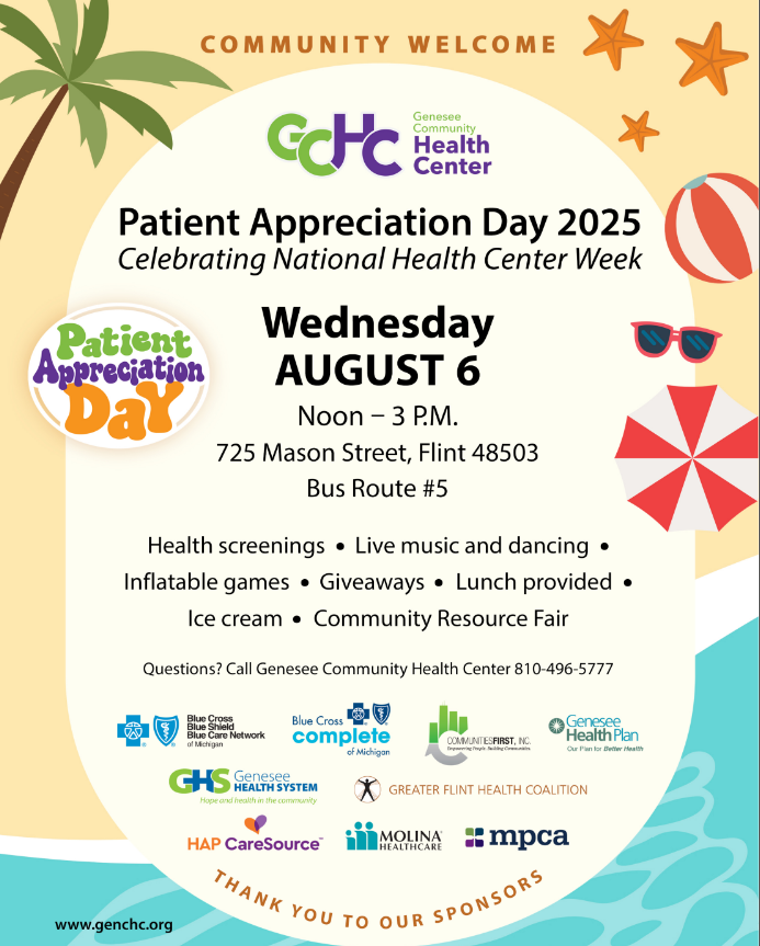 GCHC’s Patient Appreciation Day will include music, inflatable games, free health screenings, a back-to-school supplies giveaway, activities for kids, free food, and more. The event is sponsored by Genesee Health Plan, Communities First, Inc., HAP CareSource, Molina Healthcare, Michigan Primary Care Association, Blue Cross Complete of Michigan, Greater Flint Health Coalition, Blue Cross Blue Shield Blue Care Network of Michigan, and Genesee Health System.